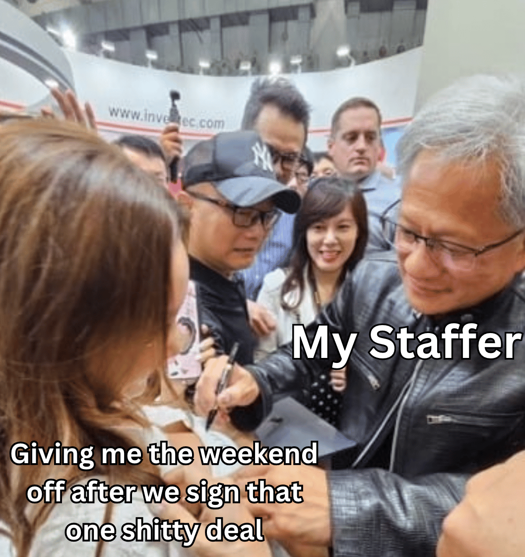 “One of my intern’s dad is the CEO of a major client. I actually don’t know the legality or ethics around him working on this deal, but we need the help so I won’t complain”